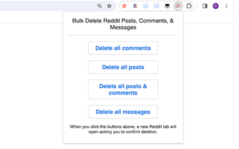 バルク削除Reddit投稿&コメント履歴は、Redditの活動をより効果的に管理したいFirefoxユーザー向けに設計された便利なブラウザ拡張機能です。このサブスクリプションベースのツールは、ユーザーが数回のクリックでRedditのコメントや投稿を一括で削除できるようにします。インターフェースには、コメントを削除、投稿を削除、または両方を削除するという3つの主要なオプションがあり、不要なコンテンツを削除するプロセスを簡素化しています。確認画面は、削除が始まる前にユーザーが進む準備ができていることを確認し、使いやすく簡単です。
